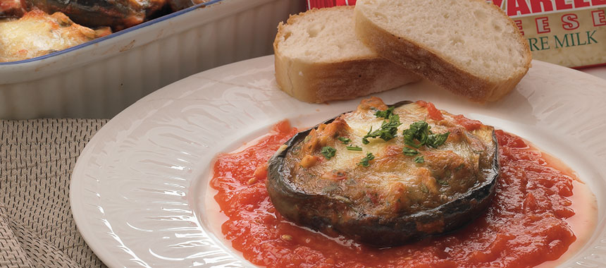 4. داخل ظرف فر را رنده گوجه‌فرنگی ریخته (بهتر است قبلاً تفت دهیم) و بادمجان‌ها را می‌چینیم سپس رویش کمی سس سفید و پنیر پاشیده در فر ۱۸۰ درجه می‌گذاریم تا پنیر طلایی شود.