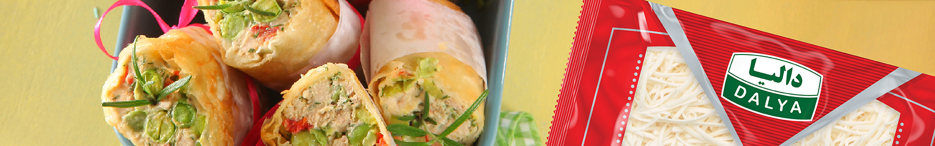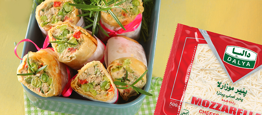 سپس روی آن قدری پنیر موزارلای دالیا بپاشید و از مواد فراهم کرده روی پنیر بریزید و آن را رول کنید.