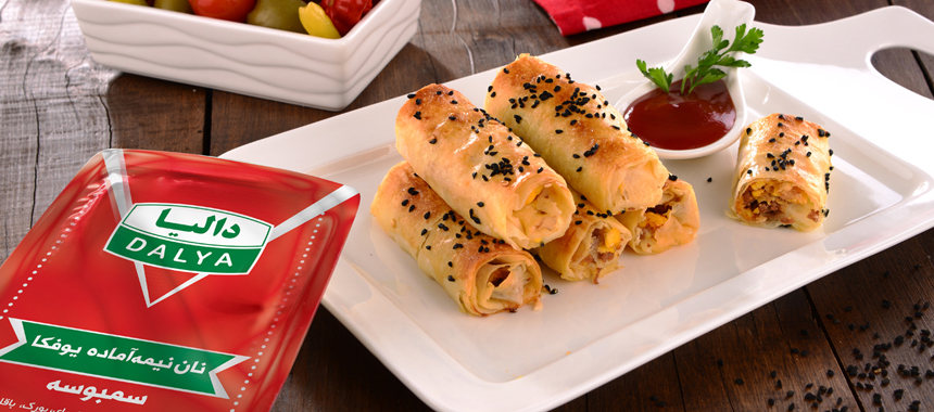 - نان یوفکا را روی سطح کار پهن کرده و روی آنها را با قلمموی مخصوص آشپزی، به مقداری کره آغشته کنید. مقداری از مخلوط را وسط نان یوفکا بریزید و دو طرف نان را روی مواد برگردانید و رول کنید. رولها را داخل سینی فر بچینید.