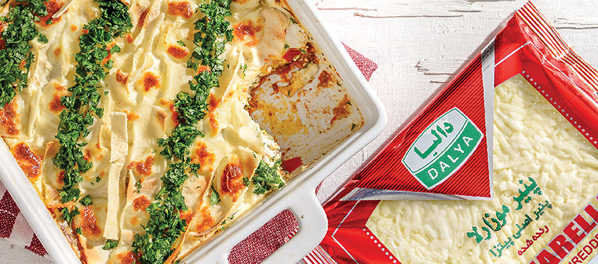 - در ظرفی كه بتوانيد در فر قرار دهيد ابتدا مايه گوشت را بريزيد و لايه بعد مايه بادمجان و لايه بعد ماست چكيده را كاملا پخش كنيد و نانهای پيتای برش زده شده را روی غذا پخش كرده و در آخر پنير موزارلا دالیا را اضافه كنيد و به مدت ۲۰ دقیقه در فر با دمای ١٨٠ درجه سانتیگراد قرار دهید و در پایان با جعفری تزيين نمایید.