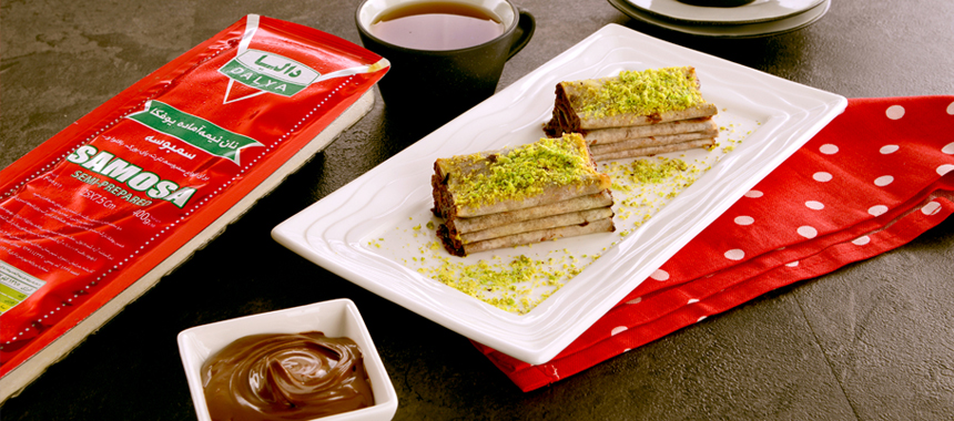 روی ۴/۱ اول آن شکلات را با پشت قاشق صاف کنید و نان یوفکا(فیلو) را تا کنید ۳ بار دیگر این کار را انجام دهید .