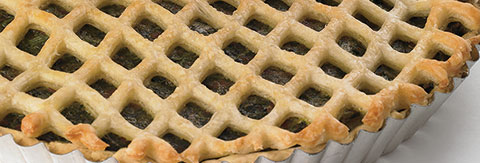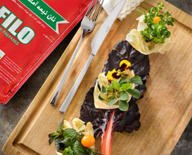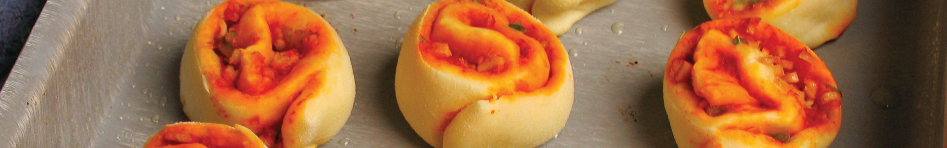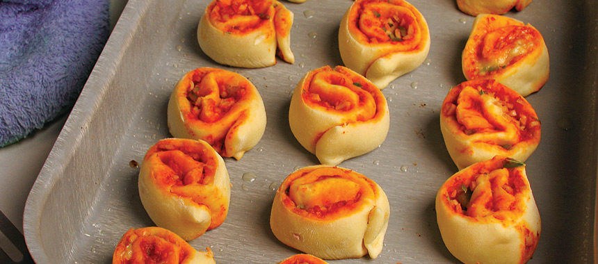 - روی دستمال تمیز آشپزخانه کمی آرد پاشیده و نصف خمیر را با وردنه به شکل مستطیل حدود ۲۰ در ۴۰ سانتیمتر باز می¬کنیم. نصف سس را روی آن مالیده و نصف مواد را روی آن می¬پاشیم. سپس به کمک پارچه خمیر را از طرف بلندی آن لوله می¬کنیم. بعد خمیر را به حلقه¬های یک سانتی برش زده و در سینی فری که از قبل چرب کرده¬ایم می¬چینیم و در فری با حرارت حدود ۱۸۰ درجه سانتیگراد می¬گذاریم تا ۱۵ دقیقه بپزد. با بقیة خمیر و مواد دوباره مراحل را تکرار می¬کنیم.