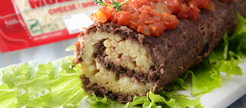 - ابتدا فر را روی دمای ۱۸۰ درجه سانتیگراد روشن میکنیم تا گرم شود. گوشت را با پیاز، نمک و فلفل مخلوط کرده ورز دهید و روی یک لایه کیسه فریزر، خوب پهن کنید (به قطر نیم سانتیمتر به شکل مستطیل)، ماکارونی آبکششده را کنار هم روی گوشت بچینید و بعد پنیر موزارلا را اضافه کرده و خوب پخش کنید، سپس با کمک، لایه کیسه فریزر گوشت را رول کنید.