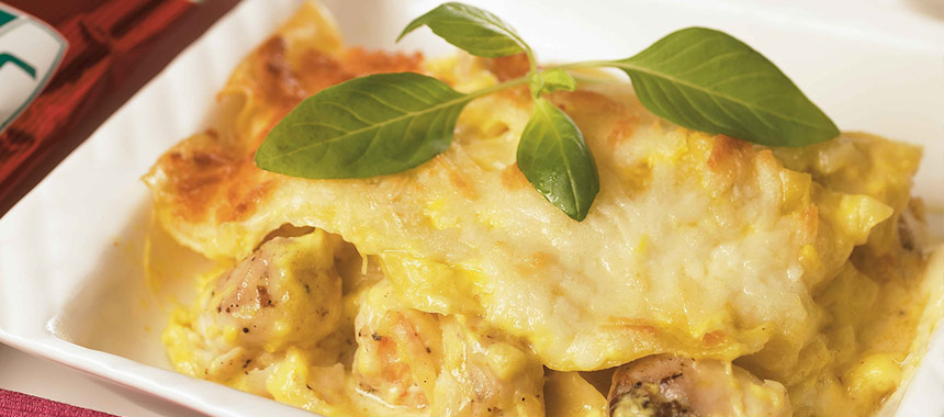 یک سوم سس را کف یک ظرف نسوز به عمق تقریبی ۵ سانتیمتر پهن کنید و کمی پنیر روی آن بپاشید، سپس روی آن را با لازانیا بپوشانید. این عمل را مجدداً انجام دهید. پس از آن یک سوم باقیمانده از سس را روی لازانیا ریخته و روی آن را با پنیر بپوشانید. ظرف را ۴۰ دقیقه در فر قرار دهید تا لازانیا بپزد.