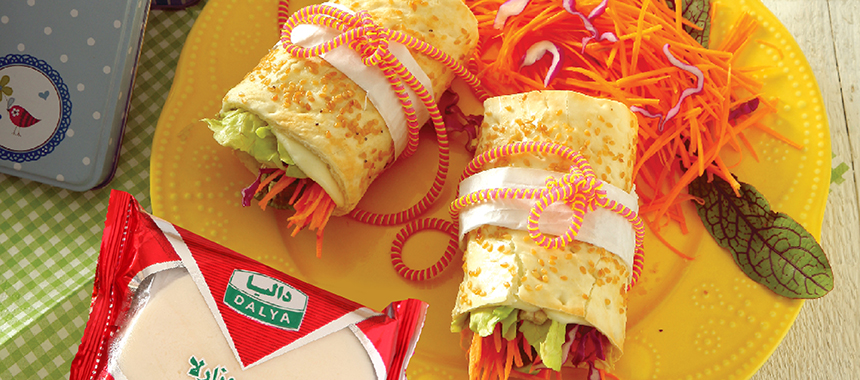 4. حال مرغ، هویج، کلم، کاهو و آووکادو را روی نان قرار دهید و رول کنید و به دلخواه بیارایید.