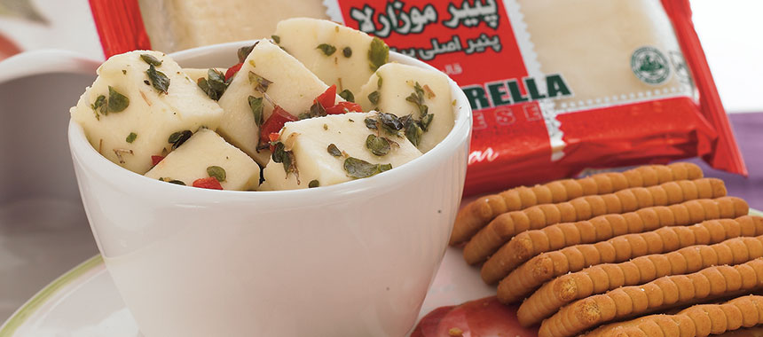 - روغن زیتون، آویشن، رزماری و نمک، فلفل، موزارلا را مخلوط کرده و حداقل ۲۰ دقیقه بگذارید بماند میتوانید این مواد را در شیشه ریخته روی آن روغن زیتون ریخته و به مدت طولانیتر نگهدارید و به همراه کراکر، زیتون، کالباس سرو کنید.
