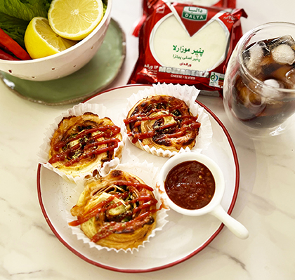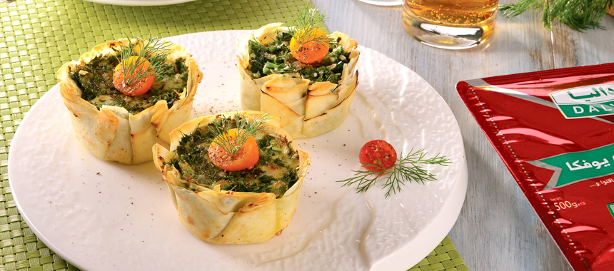 از مخلوط اسفناج داخل قالبها ریخته و لبه اضافی نان نیمه آماده یوفکا را با قیچی برش بزنید و اضافات آن را مرتب کنید.