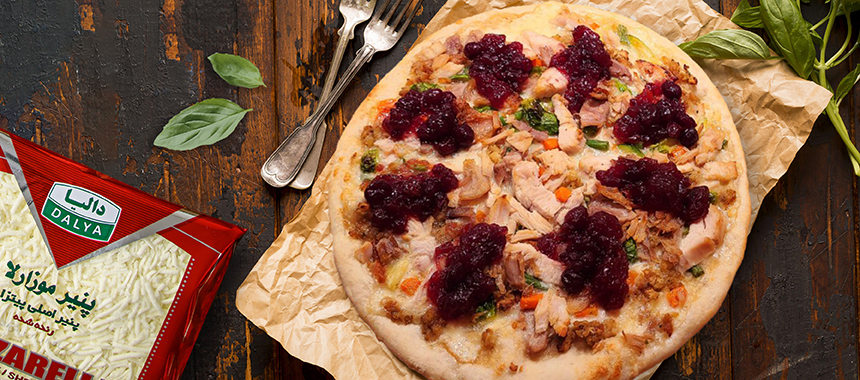 به ترتیب سس بوقلمون، پنیر موزارلا، مخلوط سبزیجات و بوقلمون را به خمیر اضافه کنید.