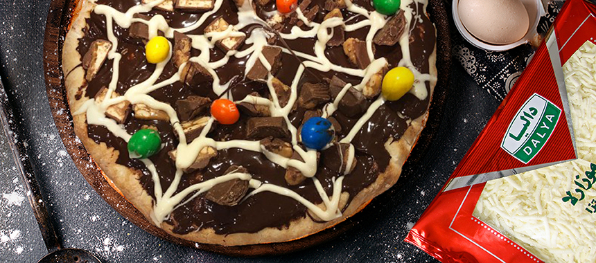 - با شکلات سفید روی پیتزا یک طرح تار عنکبوت درست کنید، بادام زمینی ام اند ام را اضافه کرده و برش بزنید و سرو کنید.