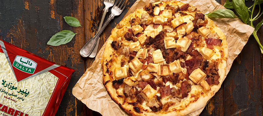 - به ترتیب سس، پنیر، مرغ، بیکن و وافل را به آن اضافه کنید.