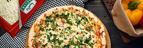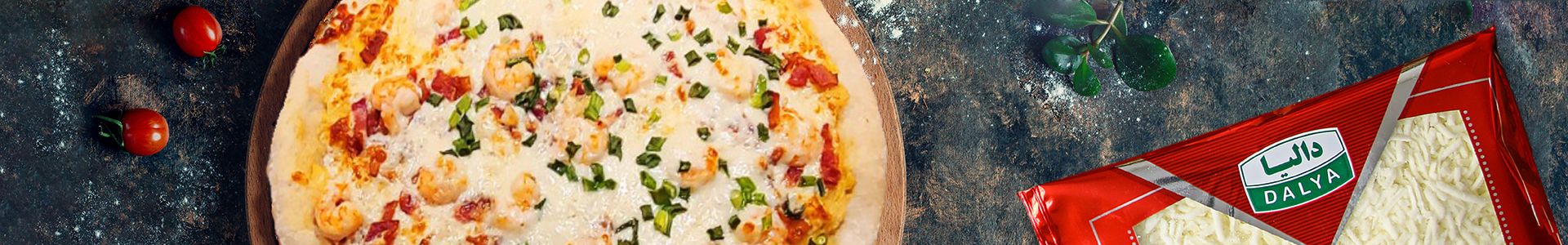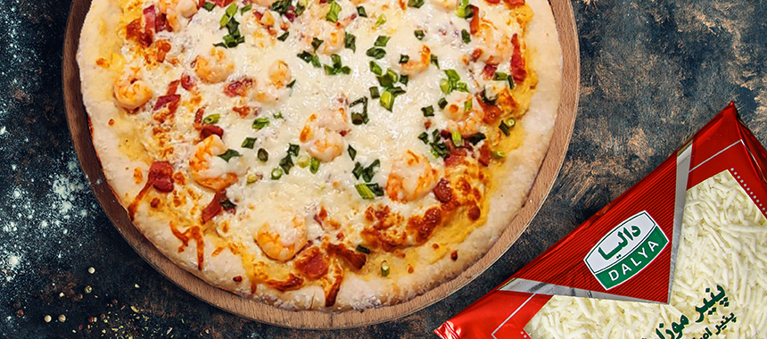 به ترتیب فرنی، ۱ فنجان پنیر موزارلا، بیکن، میگو، پیازچه را به خمیر اضافه کنید.