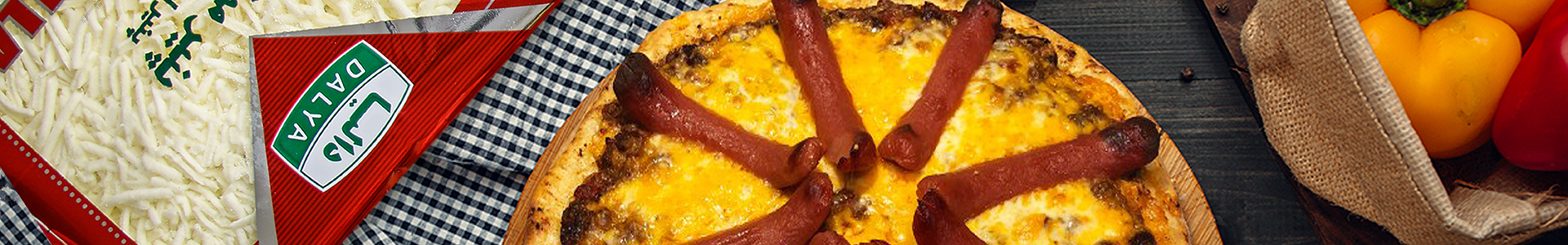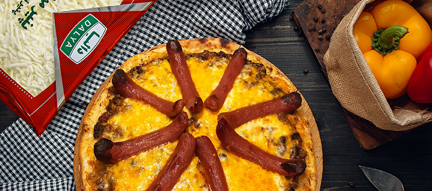 6. گوشت گاو چیلی را بر روی خمیر پیتزا بریزید، پنیر و هات داگ (در برش های طولی) را نیز اضافه کنید.