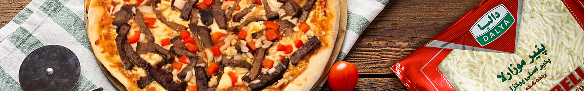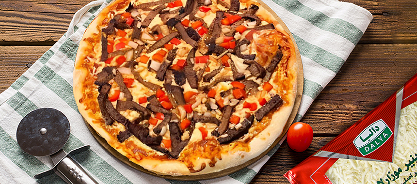 به ترتیب سس گوجه فرنگی، پنیر موزارلا، برشهای گوشت، فلفل قرمز و پیاز به خمیر اضافه کنید.