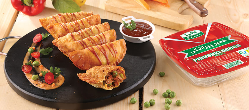- یک لایه از خمیر پیراشکی را روی سطح کار گذاشته کمی از مواد آماده شده داخل خمیر پیراشکی ریخته و برای چسبیدن لبهها، لبههای خمیر را (سفیده تخم مرغ و دو قاشق آب خوب مخلوط کرده) میزنیم و لبهها را روی هم میآوریم سپس با پهلوی چنگال لبهها را خوب فشار میدهیم تا بههم بچسبد.