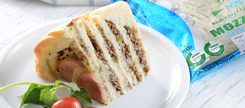 یکی از دو چانه باقیمانده را به اندازه کف قالب باز کرده و کف قالب بیندازید و چانه بعدی را به اندازه ارتفاع دیواره قالب باز کرده و به دیوارههای قالب بچسبانید و بعد مقداری سس به خمیر کف بمالید و از مواد میانی ریخته و پخش کنید و پنیر بریزید، سپس از خمیر پختهشده یک لایه گذاشته و دوباره مواد و پنیر بریزید و این کار را تکرار کنید تا خمیر تمام شود.
