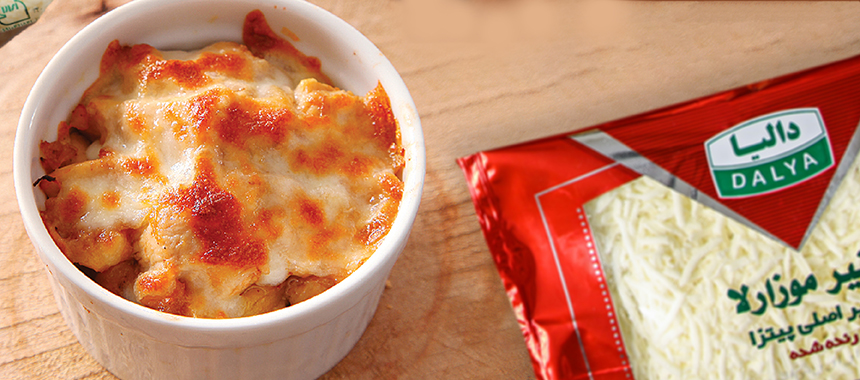 - اینک مخلوط فراهم کرده را روی سس بریزید و با پنیر و باقیمانده سس سطح آن را بپوشانید و در فر گرم کرده با دمای ۱۸۰ درجه سانتیگراد به مدت ۱۵-۲۰ دقیقه بپزید.